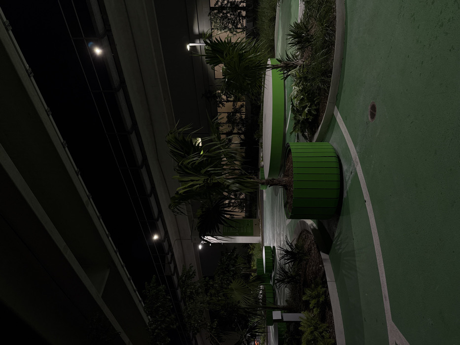 An outdoor space at night features green circular pathways lined with white. Tropical plants grow in raised planters, some cylindrical and green with horizontal slats. A large overpass looms overhead, its dark underside contrasting with the illuminated greenery. A streetlamp casts a glow on the scene, highlighting the blend of nature and infrastructure.