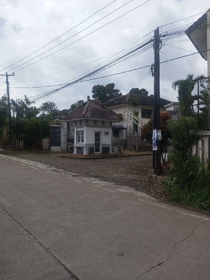 The scene depicts an outdoor environment in Sarwahi Mal., India, under an overcast sky. In the foreground, a grey concrete road with a distinctive textured, wavy pattern extends from left to right, exhibiting a diagonal crack in the lower right quadrant. Adjacent to the road on the right, a dark utility pole supports numerous overhead power lines that crisscross the upper portion of the frame. Several colored posters are affixed to this pole. Beyond the road, centrally positioned, is a small, single-story building, likely a guardhouse. It features white walls, a dark grey base, multiple white-framed windows, and a reddish-brown tiled hip roof with a small finial at its peak. An obscured dark entrance is visible on its right side. To the left of this small building, a light-colored concrete gate structure is partially visible, flanked by dense green foliage. Behind the small building and to its right, a larger, light-toned, multi-story residence with a similar reddish-brown tiled roof and an exterior staircase is present. The background is dominated by various green trees and vegetation, including some palm-like trees near the main house and dense bushes along the property lines. No individuals are present, and no active interactions or actions are observable within the depicted scene.