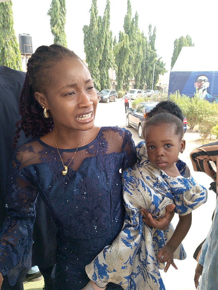 A woman in a navy blue, lace dress is holding a baby wrapped in a blue and white patterned cloth. The woman has braids and is wearing gold hoop earrings and a gold necklace. The baby has earrings and a serious expression. Behind them are trees, cars, and a banner with a man's face. Additional people are partially visible in the foreground.