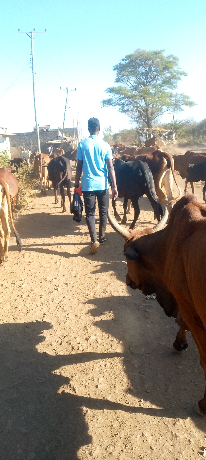 A man walks away on a dirt road, herding cattle. He wears a blue shirt, black pants, and a baseball cap. A black jacket is in his hand. Brown, black, and white cattle surround him. Tall grass lines the road. Utility poles are visible. A large tree appears in the background under a clear blue sky. The sun casts shadows on the road.