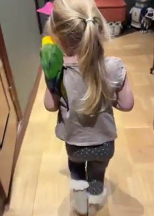 A little girl with blonde hair in a ponytail is walking down a hallway with a green and yellow parrot perched on her shoulder