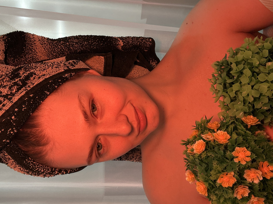 An indoor, eye-level portrait shot captures a young adult female in what is identified as Matyushino, Russia. The scene is illuminated by strong red ambient light, giving her fair skin a flushed, ruddy appearance. Her head is wrapped in a dark, patterned towel, securing her hair. She presents a slight smile and looks directly towards the camera with light-colored eyes. Her bare shoulders and upper torso are visible, with two bundles of artificial foliage held in front of her as a partial modesty cover. The left bundle features small orange flowers amidst green leaves, while the right bundle consists solely of green leaves. The background shows a light-colored, vertical surface, possibly a wall or curtain.
