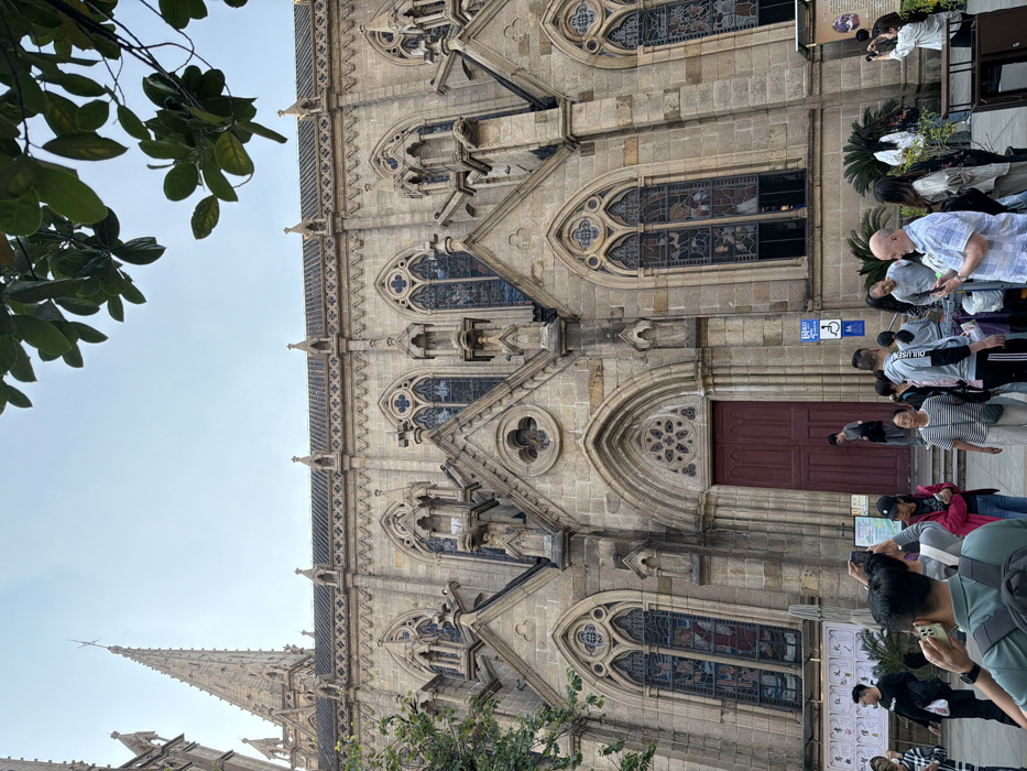 A low-angle, vertically-oriented shot showcases a cathedral facade in daylight. The building, crafted from tan stone, features ornate Gothic Revival architecture. Several pointed arch windows and doors embellish the structure. Groups of tourists gather near the entrance, some capturing the scene with their phones. Green foliage partially obscures the view on the left, adding a natural element to the urban landscape.