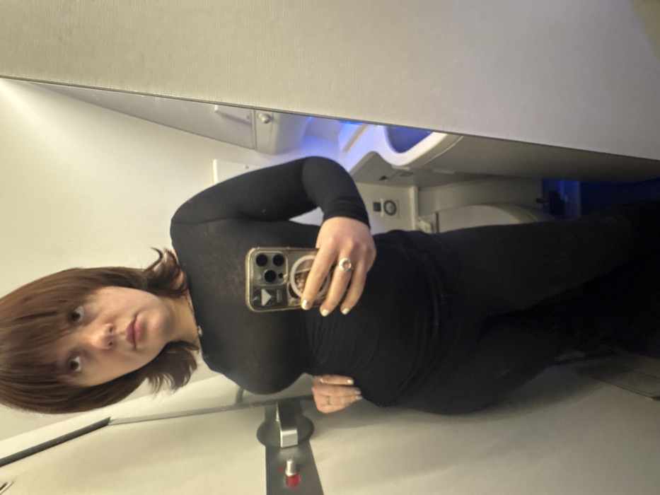 A person with brown hair and bangs poses for a mirror selfie in an airplane lavatory