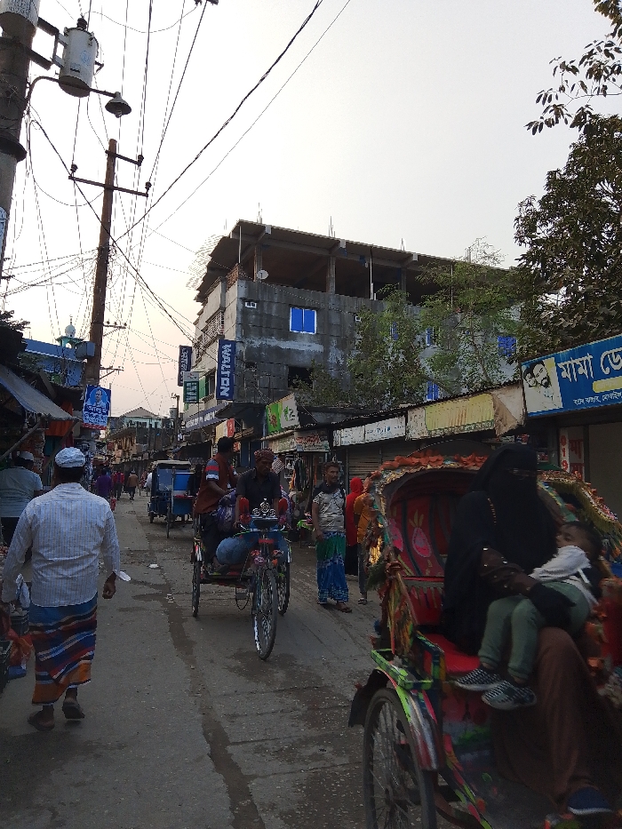 A bustling street scene in a South Asian country depicts a crowded marketplace. Pedestrians and bicycle rickshaws navigate the narrow road. A tall building with blue-tinted windows stands amidst the low-rise shops. Power lines crisscross above the scene. A woman in a burqa and child are in a rickshaw in the foreground.
