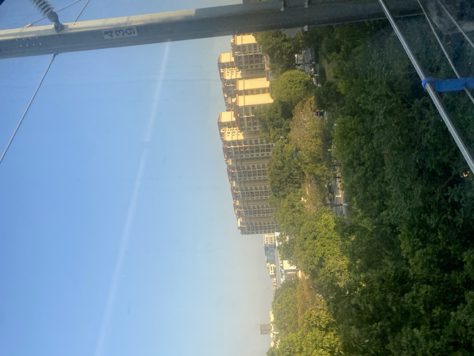 The image displays an urban landscape in Zhongshan, China, captured from an elevated perspective under a clear, light blue sky. In the immediate foreground, a metallic railing, partially wrapped with a blue ribbon or fabric, is visible along the bottom right edge. A grey utility pole, marked with the vertical numbers "439" and topped with an insulator, stands on the far right. The midground is dominated by a dense canopy of diverse green trees, partially concealing a paved road or pathway. Elements on this road include indistinct vehicles and a prominent red object. The background features a lengthy, multi-story residential building complex, characterized by light yellow facades and red-tiled roofs, extending horizontally across the frame. Further to the left in the background, a construction crane and additional urban structures are discernible. No individuals are visible, and no active interactions or actions are depicted in the static scene.