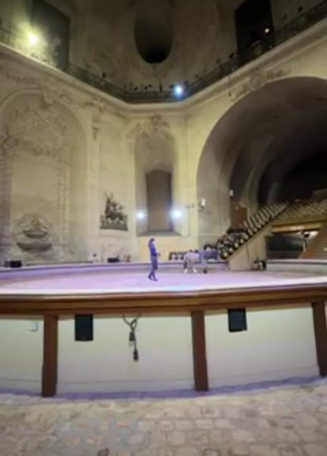 interior of a domed building that is an arena. A man in a blue jacket is standing inside a ring with a horse. There are tiers of seats full of people on one side. The camera is at ground level, set back a distance from the ring. The room is lit by overhead lights. The man appears to be giving instruction or training the horse.