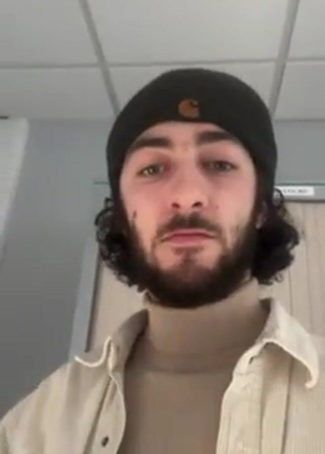 A close-up video shows a person wearing a Carhartt beanie, a tan turtleneck sweater, and a light-colored corduroy shirt