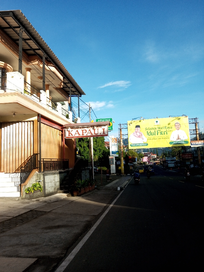 The image depicts a sunlit urban street scene in Khouathineung, Laos. On the left, a two-story building features a light peach facade with white balustrades and pillars on the upper level and a closed light brown slatted door on the ground floor. A red-bordered sign reading "RUMAH MAKAN KAPAU.1" is suspended from the building's overhang. A white concrete staircase with a dark metal railing leads from the sidewalk to the building's main entrance. Potted plants are arranged along the elevated base of the building. The asphalt road to the right shows light vehicle traffic, including multiple motorcycles, one with a rider in a blue helmet, and a distant yellow vehicle. Overhead, a large yellow billboard, mounted on a metal framework, displays "Selamat Hari Raya Idul Fitri" and images of two men. Further down the street, various commercial signs are visible, including one for an "APOTEK" (pharmacy) and others for "BNI ATM," "Telkomsel," and "SAN...". Utility poles with dense wiring are present. The sky is clear blue with sparse white clouds, and direct sunlight casts sharp shadows on the sidewalk and road, illuminating the scene.