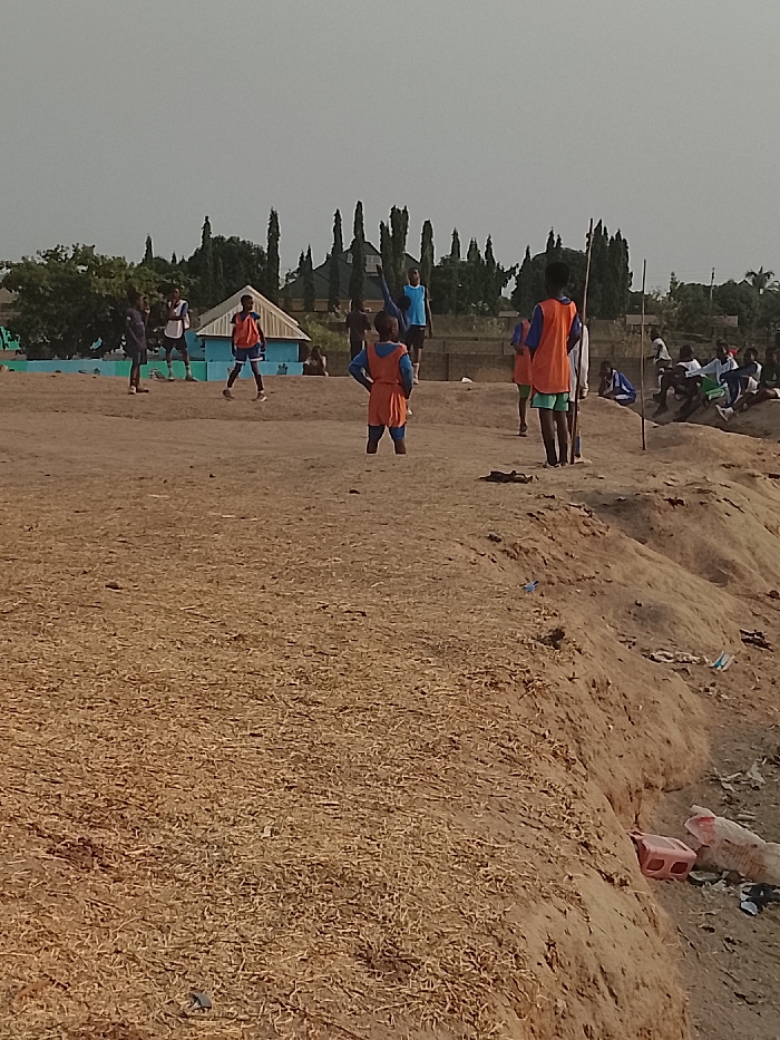 The image depicts an outdoor football field in Masaka, Nigeria, under a hazy, light grey sky