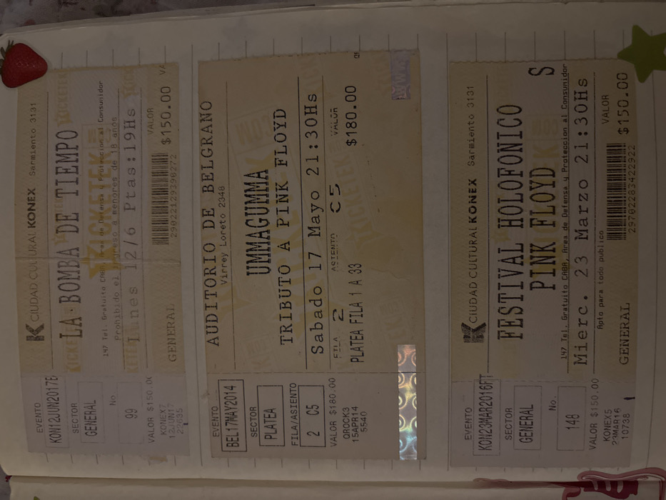 three ticket stubs pasted into a notebook. One ticket is for "La Bomba De Tiempo" at Ciudad Cultural Konex on Monday, June 12, 2017, with a value of $150. The second ticket is for "Ummagumma," a Pink Floyd tribute band, at the Auditorio de Belgrano on Saturday, May 17, 2014, valued at $180. The last ticket is for the "Festival Holofónico," featuring Pink Floyd, at Ciudad Cultural Konex on Wednesday, March 23, 2016, priced at $150. A strawberry sticker is near the first ticket, and a green star sticker is by the third.