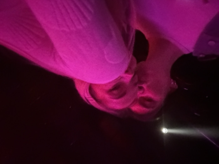 A selfie features two people with fair skin under a pink lighting source