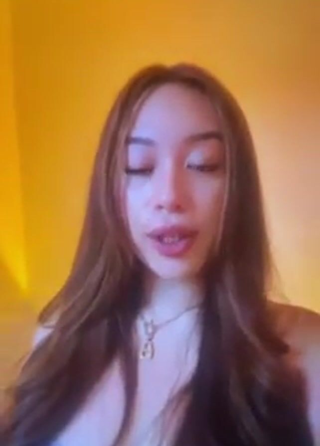 A woman with long brown hair speaks into the camera. She is wearing a light blue top and a necklace. Her background is a yellow wall. She touches her lips with her finger.