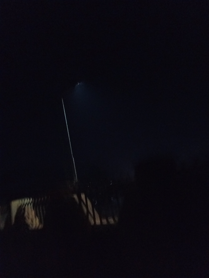 A dimly lit outdoor scene features a tall, slender street lamp casting a hazy glow in the dark sky. Below, a fence or railing-like structure is partially visible, casting shadows in the foreground. A patch of dark vegetation appears to the right, while a blurry form is seen behind the railings on the left. The overall atmosphere is heavy with darkness and minimal illumination.