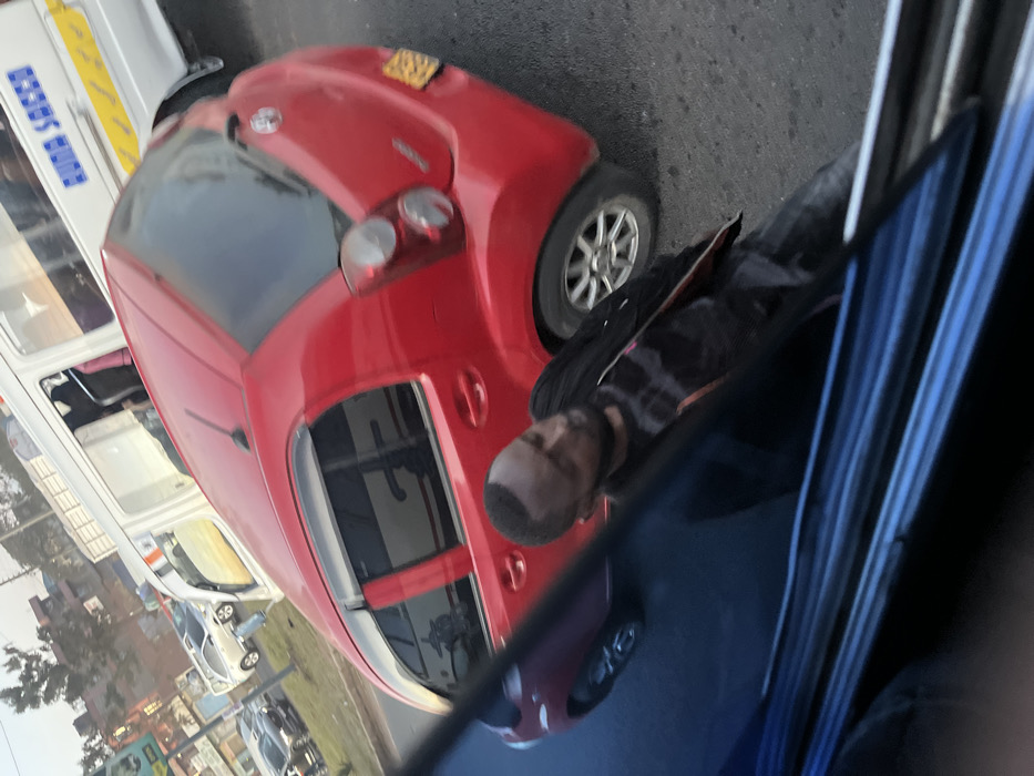 The scene depicts an urban street in Biashara ward, Kenya, under natural daylight conditions. A red five-door hatchback automobile, possibly a Toyota Passo model, occupies the mid-ground, positioned at an angle with its rear and passenger side visible. The vehicle features tinted rear windows and a yellow rectangular license plate affixed to its rear bumper. To the immediate left of the red car, a male individual with a short beard is observed walking on the asphalt surface. He is wearing a dark, possibly black, zipped jacket over a dark-patterned shirt and dark trousers. His gaze is directed towards his left. In the background, a white commercial van or minibus, identifiable by "BUNA SACCO" text and yellow striped decals on its side, is visible. Further in the background, other vehicles, including a white SUV and a dark sedan, are present on a multi-lane road alongside a grassy median and distant urban structures under a clear sky. The image is captured from the interior of a vehicle, with a dark blue portion of its frame and reflections of the street scene visible in the foreground.