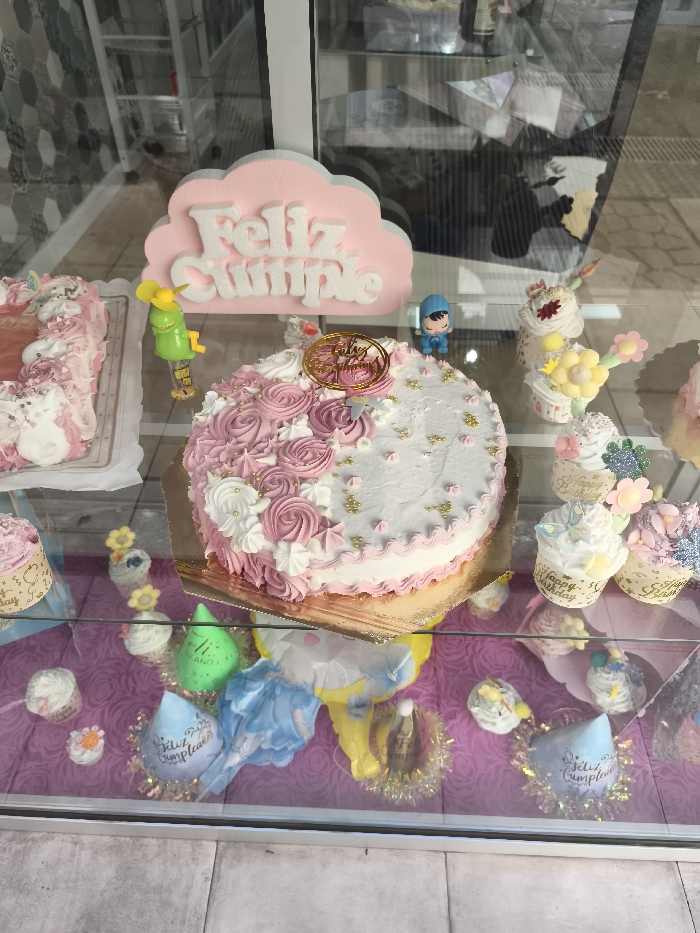 Inside a bakery or confectionery shop, location Unknown, Unknown, a glass display case showcases a selection of birthday-themed desserts and party decorations. The central item is a large, round cake resting on a gold board, half-decorated with pink and white frosting rosettes and swirls, and the other half featuring a plain white surface with scattered gold sprinkles. A gold 'Feliz Cumpleaños' cake topper is inserted into this cake. To its left, a rectangular cake with similar pink and white frosting is partially visible. Behind the main cake, a large pink cloud-shaped sign displays 'Feliz Cumple' in raised white letters. Two small figurines are present: a green, hat-wearing character to the left of the main cake, and a blue, hooded character on its right. Surrounding the cakes are multiple cupcakes, variously decorated with frosting, sprinkles, and small floral accents; some cupcake wrappers bear 'Happy Birthday' text. The base of the display is covered with a pink fabric featuring a subtle rose pattern. On this surface, several conical party hats—some blue with 'Feliz Cumpleaños' text and tinsel, one green, and one yellow with tinsel—are arranged with other small decorative elements. Reflections on the glass indicate an interior background of shelving and a patterned wall, while the foreground shows a light-colored tiled floor.