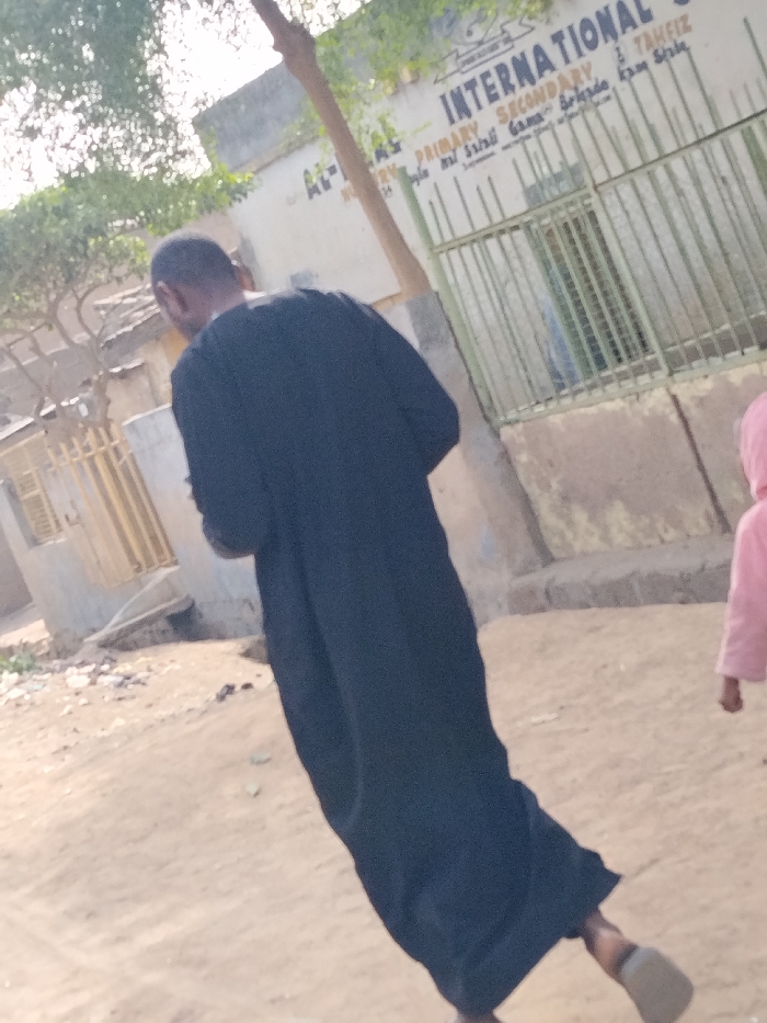 An outdoor scene in Gama, Nigeria, depicts two individuals walking on a sandy dirt path. The primary subject, seen from the rear-left, is an adult male wearing a long, dark (black) garment, possibly a thobe or kaftan, and a light-colored sandal on his left foot. His head is partially visible with short hair. To the right, a smaller figure, likely a child, is partially visible, wearing a pink hooded garment. In the background, a light-colored building wall is present, featuring green vertical metal bars over windows. Prominently displayed on this wall is text identifying it as an "INTERNATIONAL SCHOOL" offering "PRIMARY, SECONDARY & TAHEIZ" education, with "GAMA" also visible. A light-brown utility pole stands in front of this wall. To the far left, another building with yellow or light-colored metal window bars is visible. Overhead, green foliage from trees partially obscures a bright sky. Scattered debris, including small rocks, is visible on the sandy ground to the left of the main subject. The scene is illuminated by bright daylight.