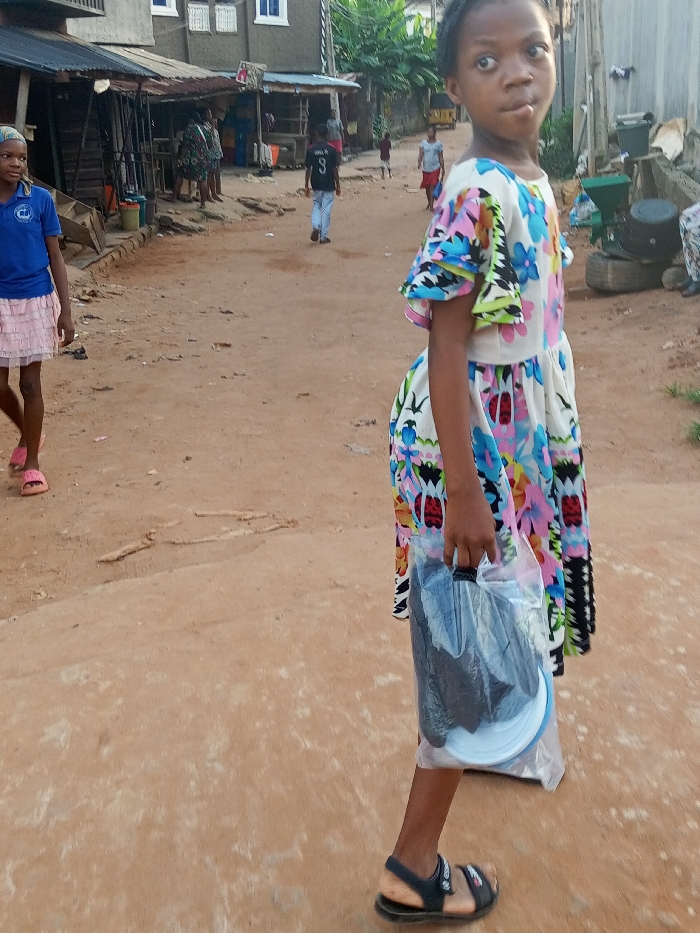 The image displays a daytime street scene in Obosi, Nigeria. In the immediate foreground, a young Black girl, approximately 8-12 years old, stands facing slightly left with a wide-eyed, open-mouthed expression, looking towards the viewer's left. She wears a short-sleeved, white dress adorned with a multicolored floral pattern in pink, blue, green, and black, along with dark sandals. Her right hand holds a clear plastic bag containing dark material and a stack of white, round items. To the left of the primary subject, another young Black girl, also approximately 8-12 years old, walks away from the viewer. She is dressed in a blue short-sleeved top with a white logo, a light pink ruffled skirt, and pink slip-on sandals. Her head is partially covered by a light-colored fabric. The ground consists of an unpaved, light brown dirt road with visible irregularities, small debris, and light vehicle tracks. In the mid-ground and background, several other individuals, including adults and children, are distributed along the road; one boy wearing a dark shirt with a white number '8' on the back walks away from the camera. The left side of the road features a series of low-rise structures with corrugated metal roofs, functioning as market stalls or small shops. Behind these, a two-story building with a plain grey facade and white-framed windows is visible. On the right side of the road, further into the background, vegetation and scattered objects, including a green machine-like item and discarded tires, are present.