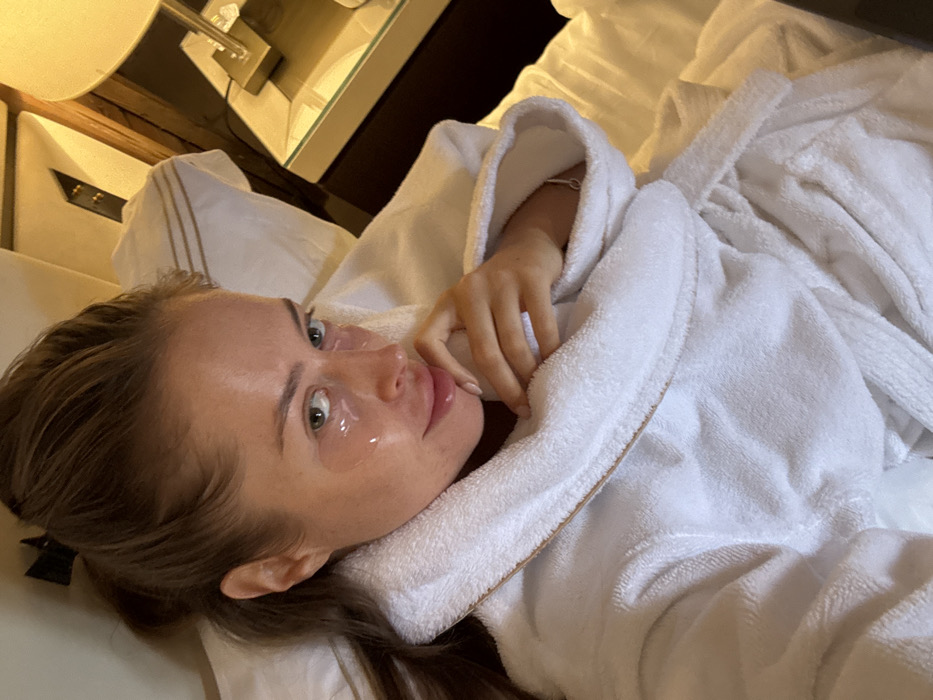 An adult female is depicted in a close-up, high-angle shot, lying on her back in a bed within a room in Courchevel, France. Her light brown hair is pulled back, revealing her forehead. Two translucent, oval-shaped gel eye patches are applied beneath each of her green eyes. She wears a white terry cloth bathrobe featuring a light brown trim along the lapel. Her left hand is positioned with fingers near her chin, partially covered by the bathrobe, and a thin silver-colored bracelet with a small charm is visible on her left wrist. The bedding consists of white sheets and pillows, some with light brown horizontal stripes. In the upper right background, a dark wood bedside table holds a brass-toned lamp with a cream-colored shade, casting a warm light. A reflective surface and another indistinct object are also on the table.