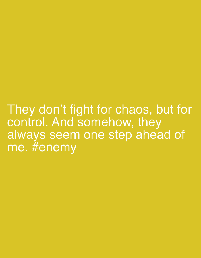 This digital image, identified as being located in the city of Troyan, Bulgaria, displays a solid, uniform yellow background across its entire vertical orientation. Prominently positioned in the lower-middle section of the frame is white, sans-serif text. The text reads: "They don't fight for chaos, but for control. And somehow, they always seem one step ahead of me. #enemy". No discernible people, subjects, physical objects, specific actions, explicit interactions, or environmental features are depicted within the image beyond the text and its singular background color.