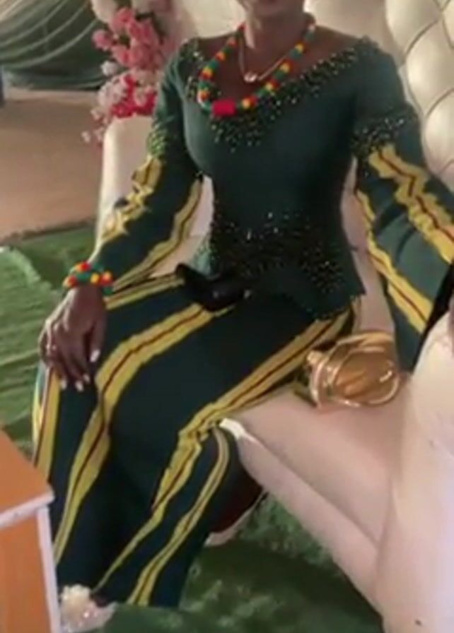 A medium, close-up shot shows a woman seated in a white, tufted armchair in what appears to be a decorated event space. She wears a traditional green outfit with yellow stripes, complemented by a beaded neckline, sleeves, and wrist jewelry. Her accessories include a matching head wrap and a colorful beaded necklace. She smiles subtly at the camera, occasionally glancing to the side. Behind her are floral arrangements and draped fabric. The floor is covered in artificial green turf. To her left sits a small wooden object.