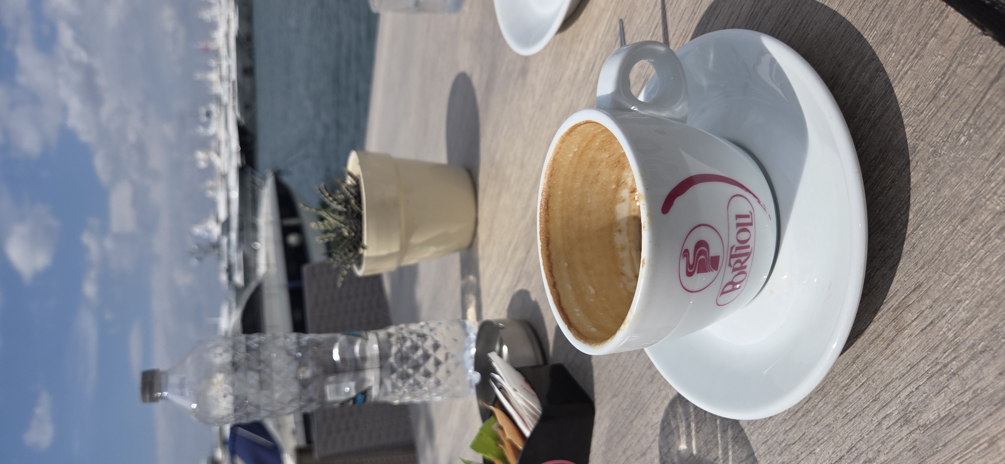 An outdoor scene in Paleo Faliro, Greece, likely at Flisvos Marina, depicts a table setting under bright daylight. In the foreground, a white ceramic coffee cup, branded "PORTIOLL" in red, rests on a matching saucer. The cup is nearly empty, showing dry, light brown coffee residue on its interior. To the left and slightly behind the cup, a half-full, clear, textured plastic water bottle with a dark cap stands upright. Further back and to the right of the water bottle is a small, light beige ceramic pot containing a green succulent plant. To the left of the water bottle, a dark-colored holder contains multiple brown sugar packets and white paper items, possibly stirrers or napkins, next to a metallic ashtray. A second, empty white saucer is partially visible on the right side of the wooden-textured tabletop. The background, out of focus, features a body of water with numerous white yachts and boats docked, under a blue sky with scattered white clouds. No individuals are present in the frame. Shadows on the table indicate direct sunlight from the upper left.