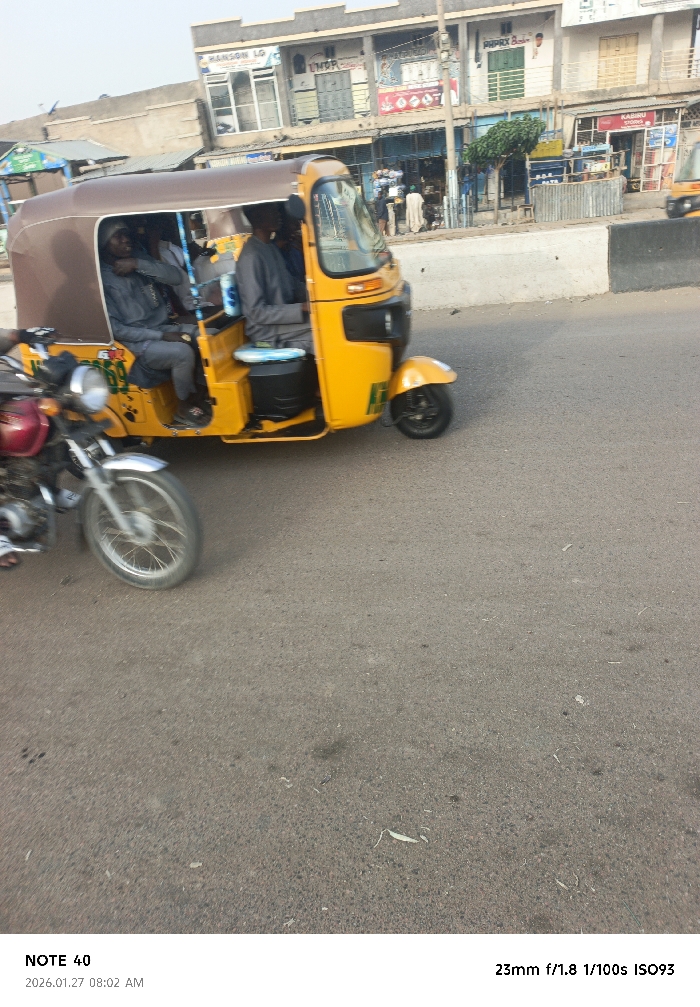 A yellow auto-rickshaw, carrying passengers, moves along a street. A red motorcycle sits to its left. Commercial buildings line the opposite side of the street, with various storefronts visible. The road occupies the majority of the frame, showing wear and some debris. The image is dated "2026.01.27 08:02 AM" and notes camera settings "23mm f/1.8 1/100s ISO93".