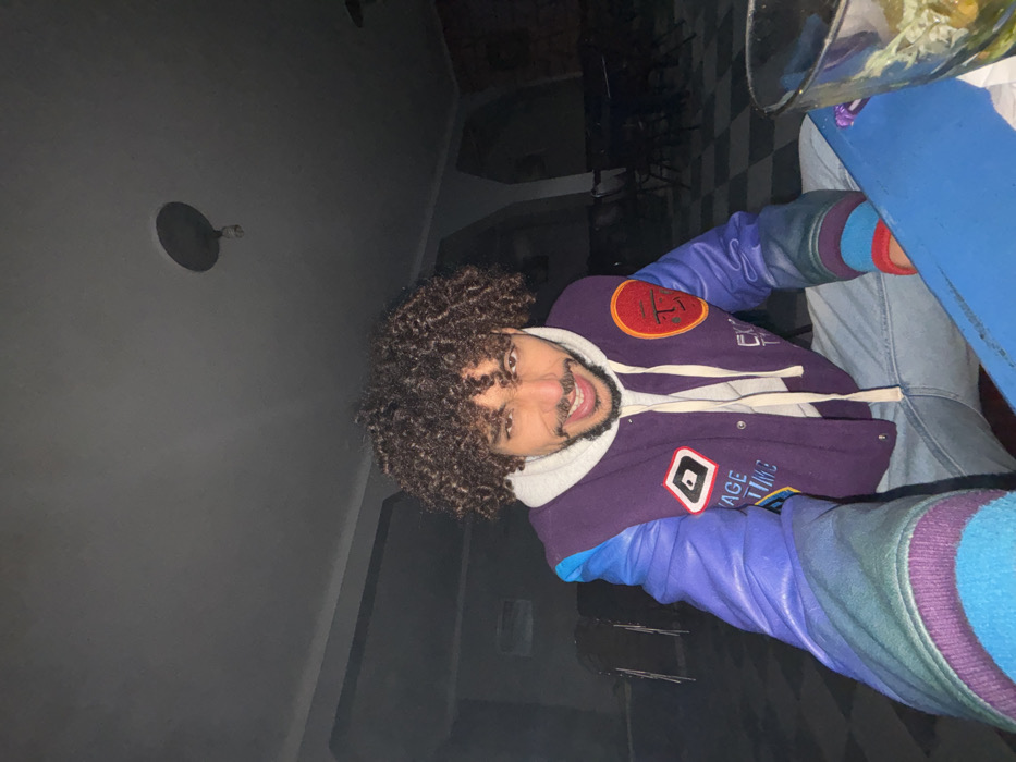 A man with curly hair grins, wearing a purple and blue letterman-style jacket over a white hooded sweatshirt and light-wash jeans. Part of a blue table is visible, with a bucket on top. The background is a dimly lit indoor space with a black and white checkered floor. A light fixture is attached to the ceiling. The man is positioned at an angle, and the image is slightly rotated.
