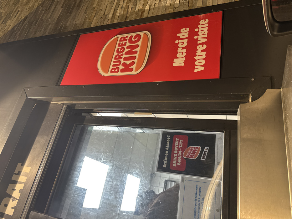 Burger King drive-through window. Above the window, there is a red sign with the Burger King logo and the French phrase "Merci de votre visite," which translates to "Thank you for your visit." The window has a sign that reads "Enfin en Alsace! DRIVE OUVERT 24H/24-7J/7," indicating the drive-through is open 24/7. There is also a small sign with fine print partially obscured by reflections.