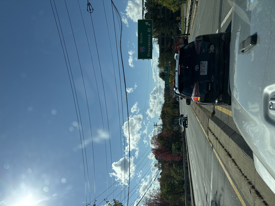 This image depicts a sunny, daytime scene on a multi-lane road in Newton, Massachusetts, United States, specifically on a road approaching I-95 South. The perspective is from the driver's seat of a light-colored vehicle, with its hood visible at the bottom of the frame. Directly ahead, a black Toyota RAV4, bearing Massachusetts license plate "6RS 491," is stationary or moving slowly in traffic. Additional vehicles are visible in the lanes ahead. The road features multiple lanes separated by yellow markings, and a concrete median strip overgrown with dry vegetation on the left. Overhead, multiple black power lines traverse a clear blue sky dotted with scattered white cumulus clouds. Bright sunlight from the upper left quadrant causes visible lens flare. On the right side of the road, an overhead green highway sign clearly displays "I-95 SOUTH Providence RI" with a white arrow indicating a rightward turn. A smaller, further sign reads "Exit 17 / Newton St / Wellesley." The environment includes trees lining both sides of the road, exhibiting autumn foliage with distinct red leaves visible on the left. A utility pole stands on the left side, and distant buildings are visible on the right beyond the highway. No individuals are explicitly visible. The overall scene suggests a congested traffic condition on a major thoroughfare.