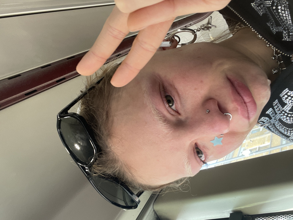 A close-up, upward-angled selfie shows a young individual, likely female, with light hair and fair skin, seated inside what appears to be a London Underground (Tube) train carriage. Dark sunglasses are pushed up onto the top of the person's head. The eyes exhibit redness and puffiness, consistent with crying. A light blue star-shaped sticker is affixed to the left cheek below the eye. The person has multiple facial piercings: two silver studs on the left side of the nose and a silver hoop on the right nostril. The visible left ear has multiple silver hoop earrings, with one featuring a small silver charm depicting a reclining figure. A dark garment with reflective or sequined patterns and a chunky silver chain necklace are visible. The right hand is raised, extending the index and middle fingers in a "peace" sign. The background reveals the light-colored ceiling and a dark red vertical panel characteristic of the Tube interior. Through a window, a blurred view of a light-colored brick building with multiple window-like features is visible, consistent with an urban environment in London.