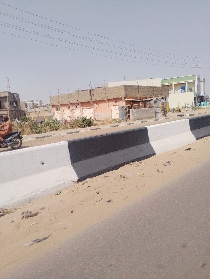 The image depicts an outdoor urban scene in Chiranchi, Nigeria, under a clear, light blue sky. The foreground features a two-lane asphalt road, partially covered by sand on its right side. A concrete median barrier, painted in alternating white and black sections, separates the road from an unpaved shoulder. This shoulder is covered in light brown sand with sparse green vegetation and minor debris. In the midground, a male individual, dressed in an orange or brown long-sleeved garment, is seated on a dark-colored motorcycle positioned on the sandy shoulder to the left of the barrier. Overhead, multiple thin power lines traverse the frame. The background consists of various structures. To the left, a multi-story, unfinished building with concrete elements is visible. Adjacent to it, a low-rise structure with multiple light-colored doors or shutters features an upper section constructed from reddish-brown blocks, potentially under construction or in disrepair, with visible framing. Further to the right, a more modern, two-story building with a light yellow ground floor and a light green upper floor, including balconies, stands. Additional indistinct buildings are visible in the far distance, along with a tall, reddish-brown communications tower on the horizon to the left.