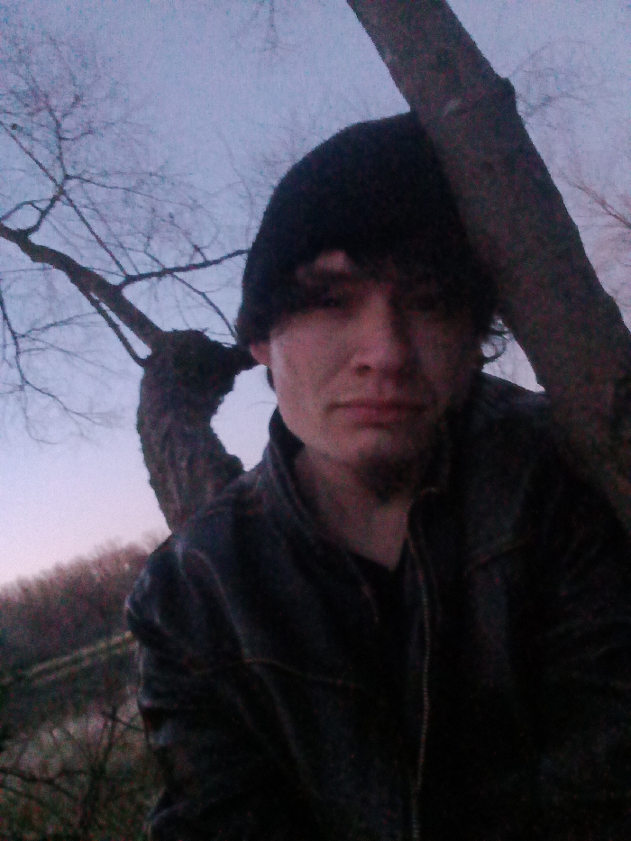 A forensic portrait-style photograph depicts a male individual centered in the frame, outdoors in Clarksville, United States, under low ambient light conditions, consistent with dusk or dawn. The individual wears a dark beanie and a dark jacket, likely denim, over a dark shirt. The subject has a light complexion, dark hair visible under the beanie, and a small goatee. Their gaze is directed forward towards the camera with a neutral expression. A large tree trunk is prominently positioned to the right of the subject, partially obscured. Another bare-branched tree with gnarled limbs is visible behind the subject on the left. The background reveals a distant, vegetated landscape, possibly a hillside or shoreline, under a cool-toned sky exhibiting muted blue and purple hues.