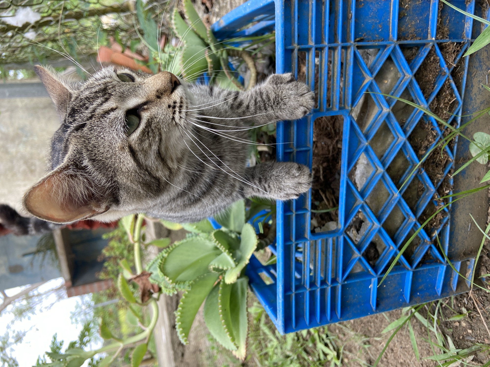 A gray tabby cat is positioned partially inside a blue plastic crate situated outdoors