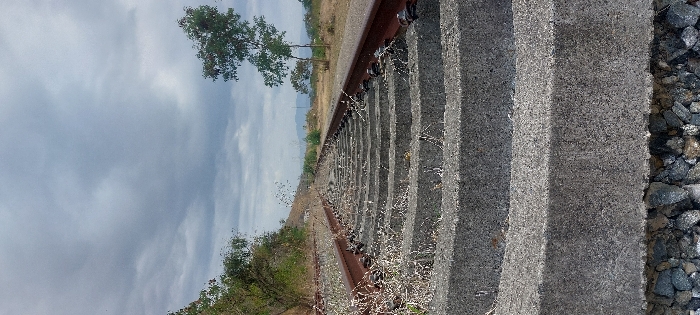 An elevated train track extends towards a distant vanishing point under a cloudy sky. Concrete sleepers support the rusty rails. Scattered weeds emerge between the sleepers and alongside the track, adding texture to the scene. A few trees stand in the background. Gravel borders the tracks on one side.
