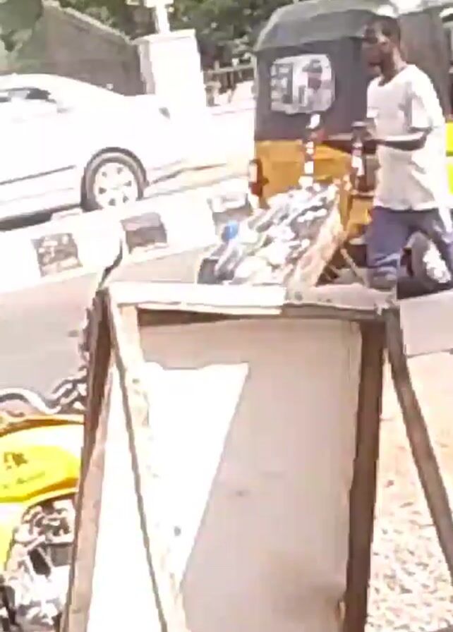 street scene with a yellow motorcycle parked on the side of the road. A Black male wearing a white shirt and blue pants is pushing a wheelbarrow loaded with various items along the sidewalk. The wheelbarrow's contents are partially covered and include bottles. The background features buildings and trees. The video is taken from a slightly obstructed perspective, with a sign in the foreground. The man continues walking down the sidewalk, pushing the wheelbarrow.