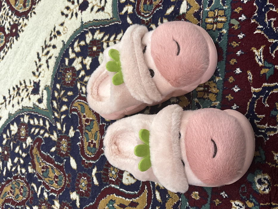 Two pink, plush slippers rest on a patterned rug