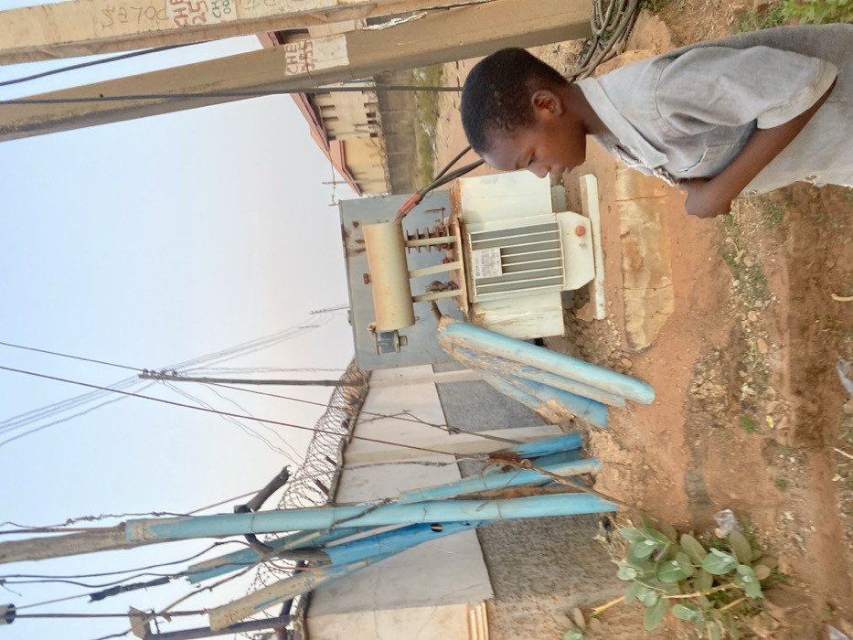 An outdoor scene in Sabon Gari Nassarawa, Nigeria, features a young person and electrical utility infrastructure under a clear sky