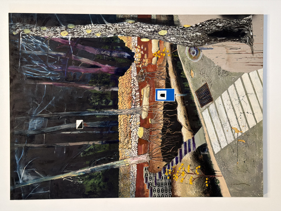 This image is a painting depicting a stylized, layered landscape that incorporates both natural and urban elements. In the foreground, a grey, cracked asphalt surface occupies the lower section. It features a white pedestrian crosswalk with five broad stripes, upon which two small, abstract yellow leaf-like shapes are present. To the right of the crosswalk, a dark, rectangular metal grate is embedded in the asphalt. Further right, a thick, gnarled tree trunk with dark bark and prominent white and pale yellow circular markings rises vertically. Its base exhibits an exposed, dark hollow and visible roots that appear to merge with a small, spiraled circular design on the surrounding pavement. The midground reveals an elevated landscape behind the asphalt. To the left, a grey concrete block wall with a repetitive geometric pattern is visible, adjacent to a set of purple-toned steps ascending upwards. The elevated terrain consists of reddish-brown earth with numerous dark, gnarled tree roots and several tree stumps. Integrated into this earth are structures resembling weathered, low walls or foundations, topped with a layer of countless small, light brown, rounded stones or tiles. Two primary tree trunks rise vertically from this earthen layer. Centrally positioned, a blue rectangular road sign with a white arch icon, denoting a tunnel, is mounted on a slender pole. To the left of this sign, a small bush with bright yellow leaves or flowers is visible. The background transitions into a dense, dark forest or woodland, characterized by numerous tall, slender, dark tree trunks and branches. Some branches are highlighted with light blue or white lines, contrasting against the dark foliage. Patches of dark green are intermittently visible within the trees. A small, white rectangular sign with a black diagonal division (upper left to lower right) is attached to a tree trunk in the upper-left quadrant. No people are depicted, and no specific actions or interactions are occurring within the scene. The painting presents a composite environment blending natural woodland features with elements of urban infrastructure and exposed earth, suggesting a layered or cross-sectional view. The image is a stylized artwork and does not depict a specific, photographically identifiable location within the city of Ibiza, Spain.