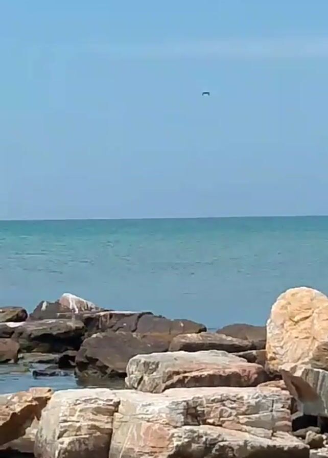 rocky shoreline with a turquoise ocean under a clear blue sky. Several birds are perched on the rocks, including a white egret and several black cormorants. The rocky terrain gives way to a pebbled beach closer to the camera. In the distance, a landscape with hills is visible. The video is taken with an Infinix SMART 8 smartphone.