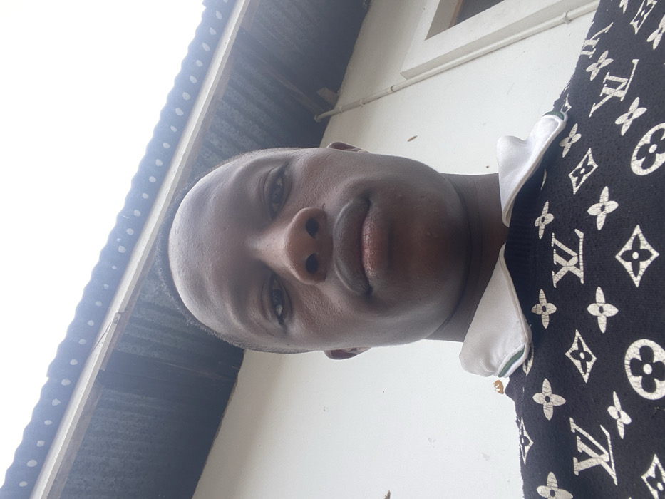 The image is a selfie taken by a young Black male wearing a black sweater with a white collar and a white and green pattern. The pattern consists of the Louis Vuitton logo. He is standing in front of a white wall with a corrugated metal roof above. The photo was taken in Dar es Salaam, Tanzania, at the coordinates -6.889, 39.286. The man is looking directly at the camera.