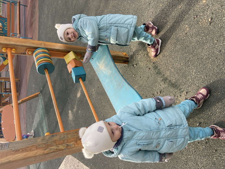 This image depicts two young children on an outdoor playground in Krasnoyarsk, Russia
