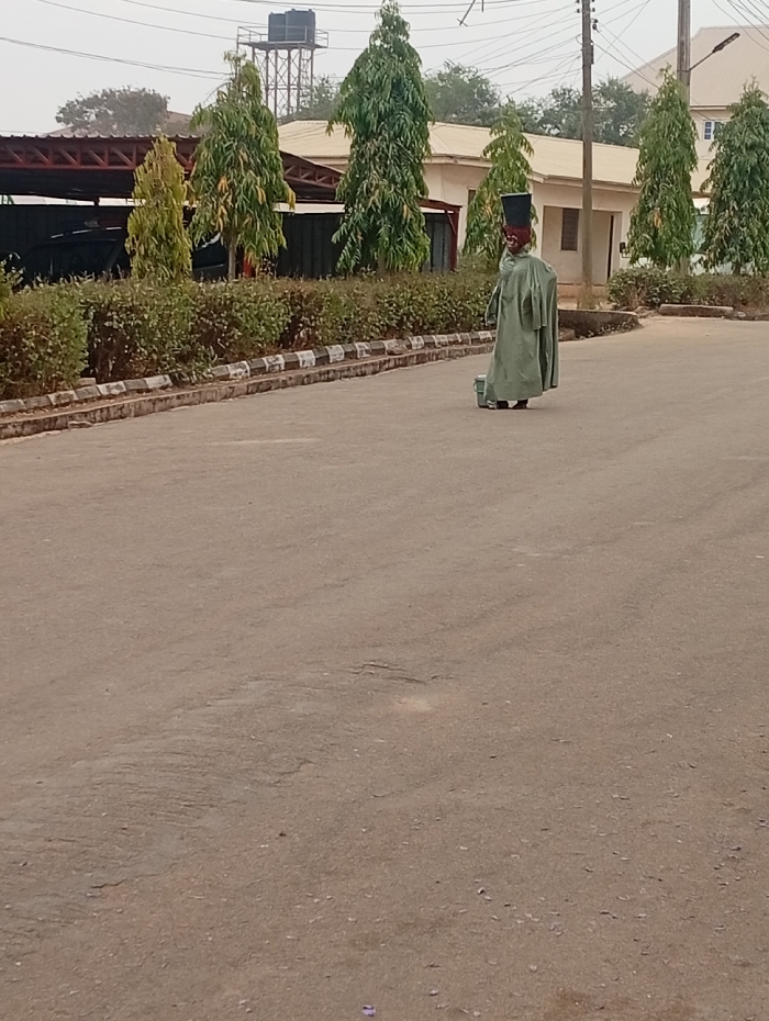 A person in a flowing, light-green robe and a tall, dark hat walks down a wide, gray asphalt road. They are facing away from the viewer, heading into the distance. The road is lined with trimmed bushes and tall, slender trees. Buildings can be seen in the background on either side, along with a water tower on the left. The sky is overcast and hazy.