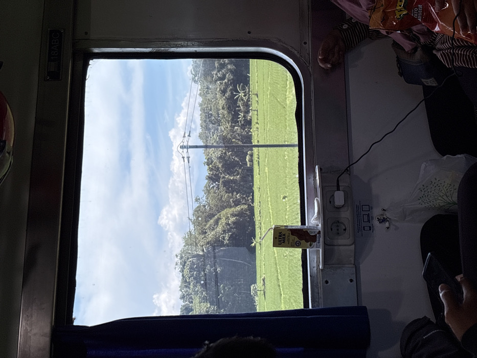 view from a train window. Outside, there's a lush green field with trees and utility poles. The sky is blue with scattered clouds. Inside the train, there's an outlet with a phone charger plugged in. A small carton of "Ultra Milk" chocolate milk is near the window. Part of a person's hand holding a phone is visible, along with some luggage and clothing.