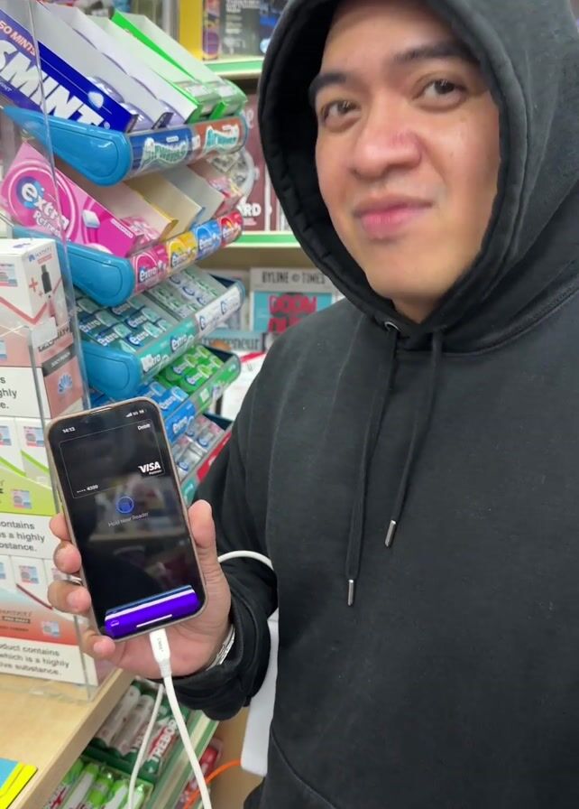 In a convenience store, a man in a black hoodie is paying at the counter. He holds up an iPhone with a Visa Platinum card displayed on the screen for contactless payment. The phone is connected to a white charging cable. The transaction is successful. A store clerk is partially visible behind the counter. The counter is cluttered with various items, including candy, lighters, and informational pamphlets. Shelves filled with magazines, candy, and other merchandise are visible in the background.
