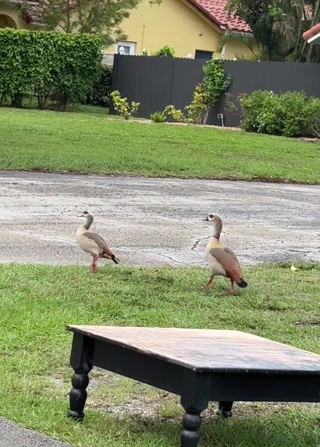 Two Egyptian geese are standing on the lawn and sidewalk near a residential street. A black coffee table with a wood top sits in the foreground. Across the street is a yellow house with a red tile roof, surrounded by green landscaping and a black fence. The sky is overcast.
