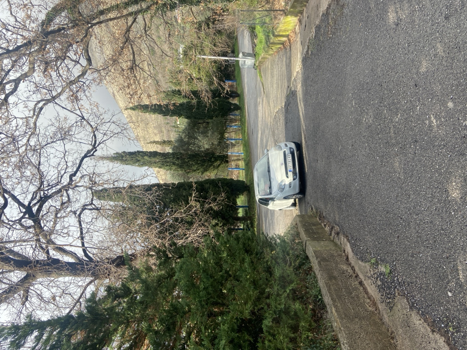 The image depicts a white Fiat Punto, bearing Montenegro license plate "KV 162 KV", positioned on a paved asphalt surface within the city of Krstac, Montenegro. The vehicle is angled slightly toward the left, with its front wheels on a darker asphalt path and the rear on a lighter, possibly worn, paved area. To the immediate left of the asphalt path, a concrete curb or low barrier runs horizontally, behind which dense green conifer trees form a hedge. In the middle ground, a line of tall, slender cypress trees stands upright, interspersed with other deciduous trees with bare branches. Behind these trees, a low fence with blue vertical posts and horizontal bars is visible. The background features a prominent, rocky, sparsely vegetated mountain or large hill under a pale, overcast sky. Numerous bare deciduous trees frame the upper portion of the scene. On the right side of the image, a grey utility pole or lamp post and a grey waste bin are visible near a slight bend in the path. The ground is a mixture of asphalt, dirt, and sparse vegetation. No human subjects are present in the scene. The overall impression suggests a winter or early spring day.