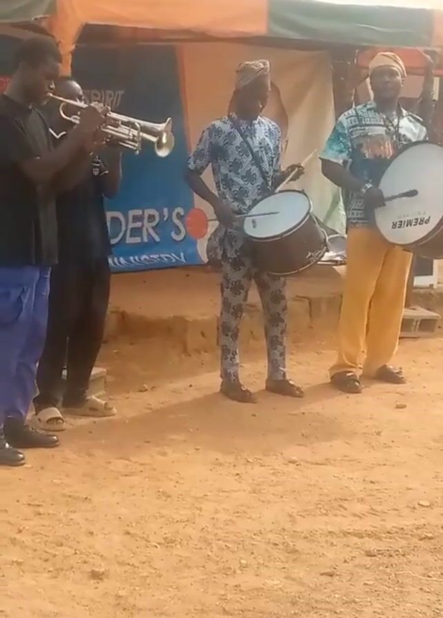 musical performance by a group of four people, occurring outdoors on a reddish-brown, possibly dirt, surface. Three men are positioned closely together in the center of the frame. Two of the men are playing drums of similar size, both holding drumsticks. The man on the left wears a blue and white patterned outfit, while the one on the right is dressed in a patterned shirt and yellow pants. A fourth man is to the left of these three, and he is playing the trumpet. They are standing in front of a tent-like structure with a banner displaying text. The background is partially obscured, but hints of a building and other people are visible. The video is labeled with “TECNO SPARK” at the bottom.