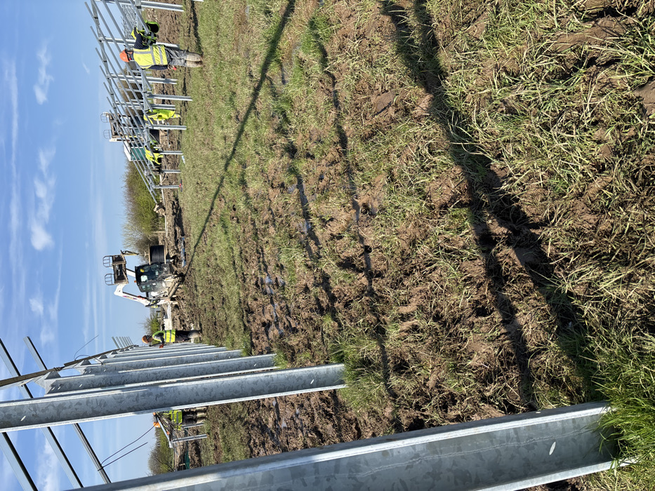 The scene depicts an outdoor construction site in a field located in Affoulia, Ireland, under a clear blue sky with minimal cloud cover. The ground is predominantly muddy, churned earth with patches of green grass, showing visible tire tracks and footprints. Multiple rows of galvanized steel support structures, composed of vertical posts and horizontal rails, are erected across the field, indicating the construction of a solar farm. At least five individuals are present, dressed in personal protective equipment including orange or yellow hard hats and yellow high-visibility vests. In the mid-ground, a white compact track loader, identified as a Bobcat, is visible with a black cylindrical object, resembling a cable reel, suspended from its front attachment. Further in the background, another piece of heavy machinery is positioned near additional partially assembled steel frames. Workers are distributed throughout the site, engaged in the assembly and installation of these structures. Bright sunlight illuminates the scene, casting distinct shadows from the steel posts onto the muddy terrain.