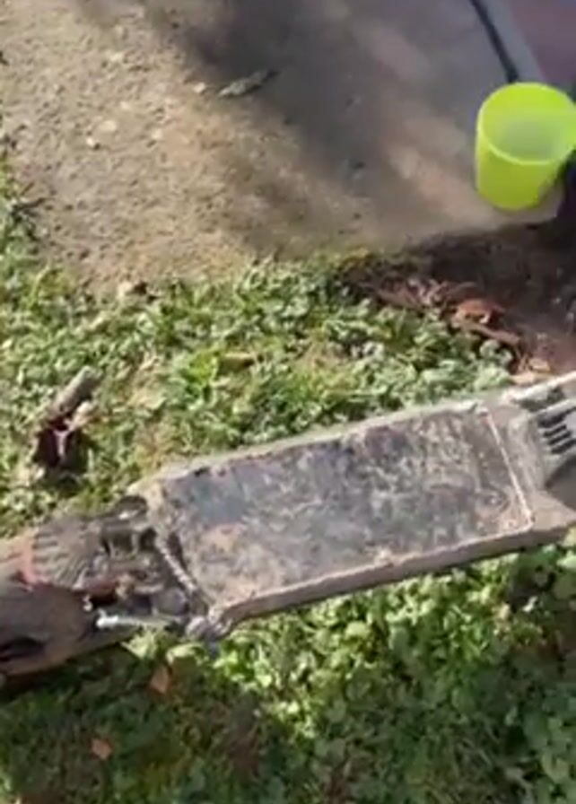 A man is standing outside, with an electric scooter on the grass in front of him. The scooter, a KuKirin, is dirty, with mud on the deck. The scooter's digital display is visible and powered on, showing the scooter is in 3rd gear. The scooter appears to be malfunctioning as it’s making a rough rattling noise. A green bucket can be seen next to a white wall.